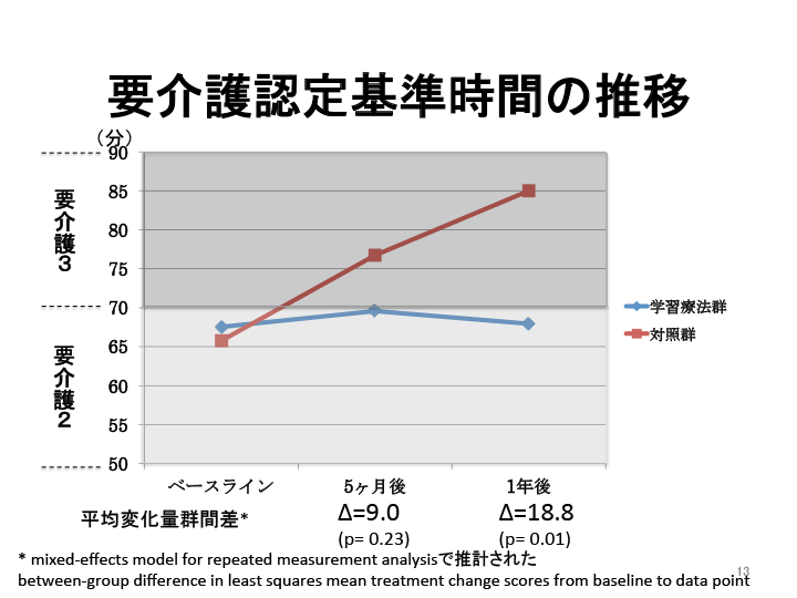 学習療法を1年間実施された認知症高齢者の方々は、要介護認定基準時間が1年後ほとんど変わらなかったのに対し、学習をされなかった方々は介護度が進みました。