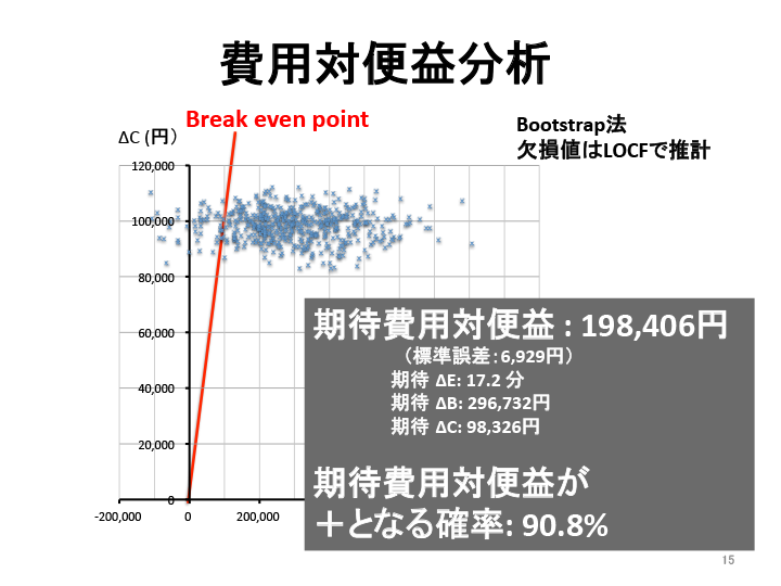 今回の調査に参加いただいた皆様のデータを元に、介護保険の費用対便益分析を実施したところ、費用対便益がプラスになる確率は約91%となり、1人あたり1年間で平均20万円近い、介護費用の節減効果があることが明らかになりました。