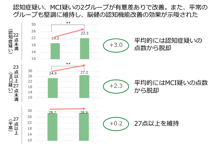 (2)認知症予防プログラム「脳の健康教室」に週1回5か月間通った結果、認知機能の維持・改善傾向が明らかになりました